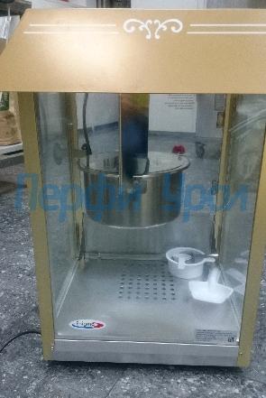 Попкорн аппарат настольный, без тележки, имеет котёл из нержавеющей стали, боковые панели из закалённого стекла, сборник нераскрывшихся зерён, главный выключатель. Объём котла - 10унций. Верх и боковые стойки аппарата - золотистые.