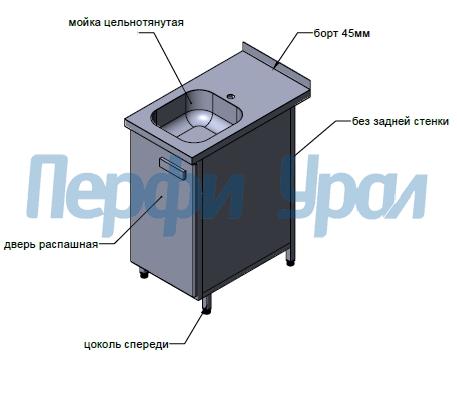 Модуль с мойкой 500х700х850мм, цт мойка 400х500х250мм, дверь, отв. смес, цоколь, нерж