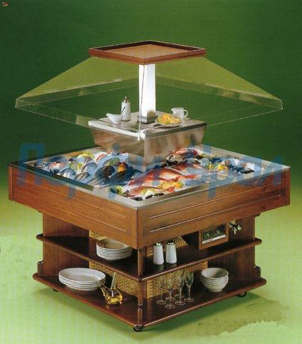 Охлаждаемая витрина для выкладки морепродуктов, охлаждаемый объем 970х970х80мм заполняется льдом. Предусмотрена автоматическая разморозка. Варианты цвета дерева: темный орех (Cod.4), светлый орех (Cod.5), цвет необработанного дерева (Cod.7), белый лак (Cod.6).Content for class "cl" Goes Here
