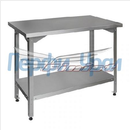 Каркас - гнутый угловой профиль, из нержавеющей стали. Столешница из нержавеющей стали. Опорные подпятники с регулируемыми полиамидными опорами. В комплекте : сплошная полка из нерж. стали.Content for class "cl" Goes Here