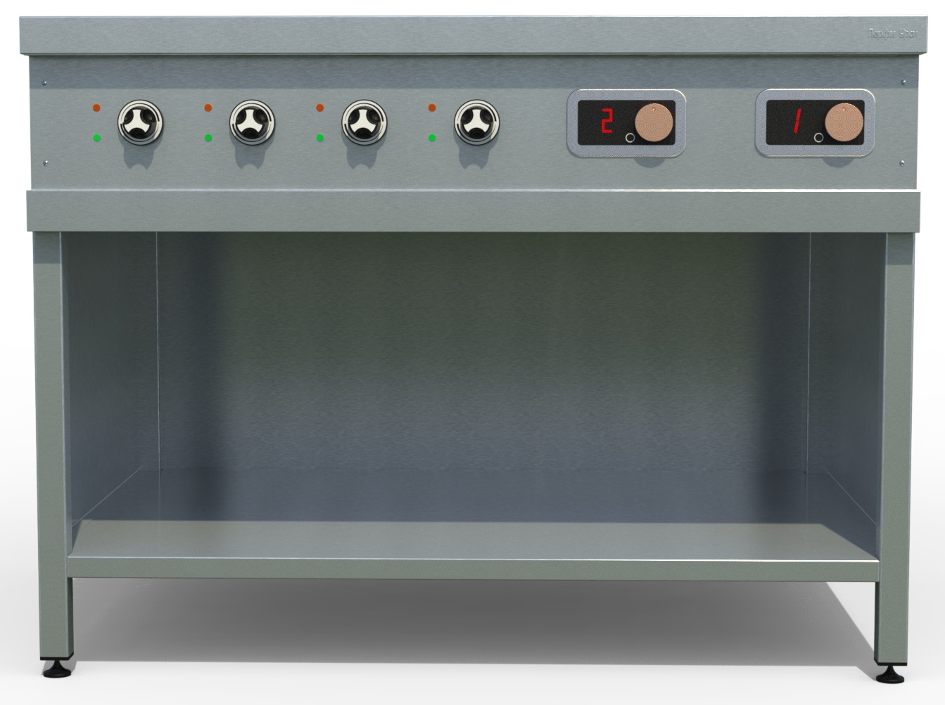Индукционные конфорки для быстрой тепловой обработки и экономии электроэнергии, а чугунные для безопасной установки тяжёлой наплитной посуды, к примеру 50 литровых баков. По запросу, возможно другое соотношение и количество конфорок. Корпус выполнен из нержавеющей стали. Опционально можно заказать: Кран для подачи воды в наплитную посуду, распашные или двери купе в нижней части плиты.